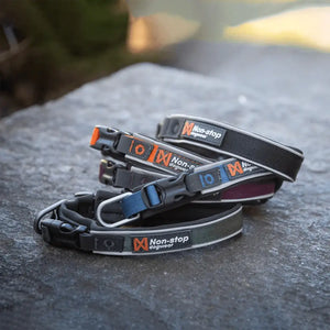 Zgarda Roam vine în culorile negru, portocaliu, albastru, violet și verde. Zgarda este disponibil pe dimensiunile XS-XXXL.