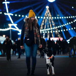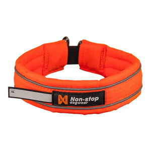 Culoarea saturată cu dungi reflectorizante duble îl face foarte vizibil la distanță. Zgarda Safe vine cu o etichetă de cauciuc pentru nume din cauciuc. Lesa se atașează la ambele inele D. Când este conectat, gulerul este blocat și funcționează ca un zgarda normala.