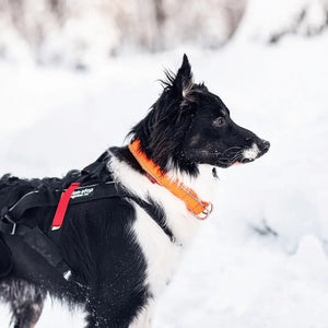 Am dezvoltat o zgarda sigură pentru câinii care aleargă frecvent în natură. Dacă zgarda se blocheaza intr-un obstacol, designul unic cu bungee facilitează eliberarea câinelui. În acest caz, s-ar putea să pierzi zgarda, dar nu și câinele tău!